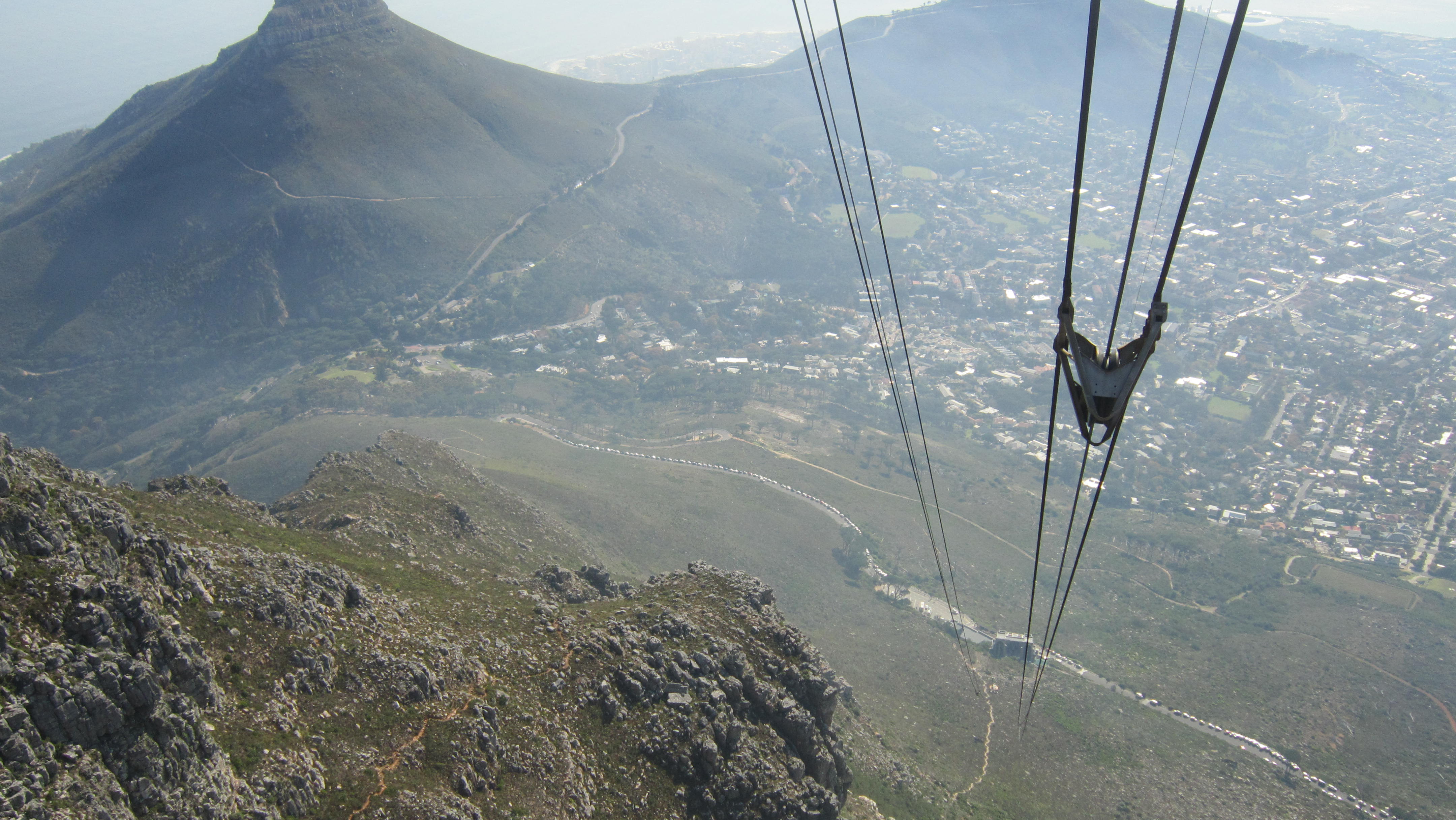 The drive to the cable car station was stunning. Table Mountain is a massive mountain slapped just in from the sea. It’s 1100 m high – virtually straight up! With a flat top. Its 3 kilometres long and the rise would only be about 10 meters from the highest to the lowest points. You drive about half way up then catch the cable car. It goes up for 1200m on a 45 degree angle.