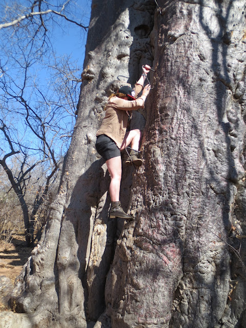 The climax of the walk was a 2000 year old Baobab tree. It was amazing. So massive. Sarah climbed half way up – which was extremely difficult. They had put climbing spikes into the wood but were set for a very tall man – to stop kids climbing it. And the surface of the tree was like a polished table tap – so smooth and shiny. Nothing to grip onto or get your toes into. If you climb to the top you can see four countries. Namibai, Botswana, Zambia and Zimbabwe. Maybe you would get to see them as the helicopter comes to take you to hospital. This tree was huge.