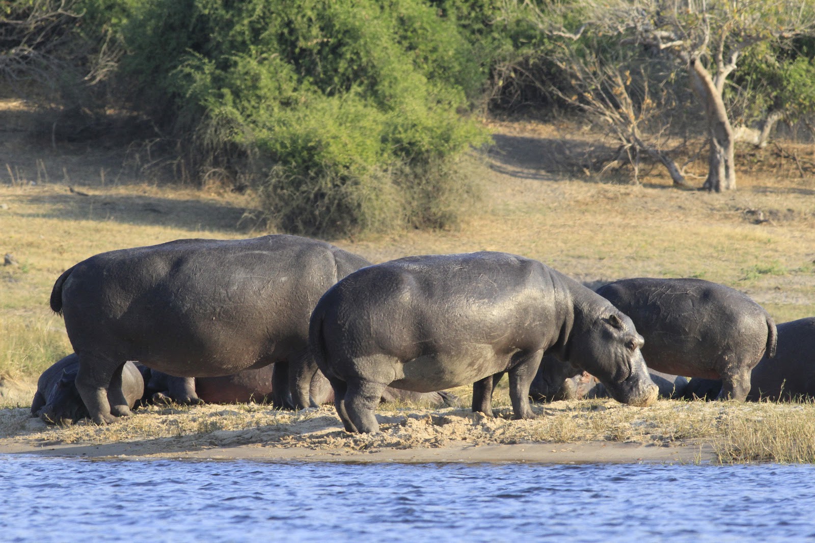 Hippos – in the water eating; in the shallows sleeping. On the banks grazing; way back in the flat areas grazing.