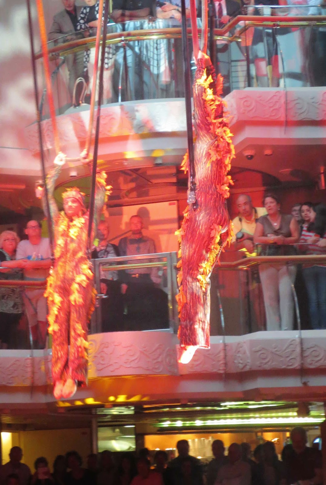 Then, later that night we got the long version of the aerial show, and it was great. Three ‘dances’ were hooked up on huge bungy cables and hung and swung from the roof.