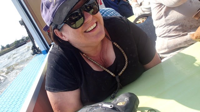 The day before the trip Sarah had a panic. When it was mentioned that the Baltic area had an August average of around 18-20 degrees with around 12 degrees at night and a fair bit of rain, she realised that she had no warm clothing nor rain protection. A quick shopping trip fixed this with the purchase of a rain coat. Of course with the heat wave that chased us the jacket was just excess luggage. But on this day Sarah took it as it was overcast.We were travelling along on the boat. As we came around a corner we hit a bit of wind and some big waves. And coped a huge splash.