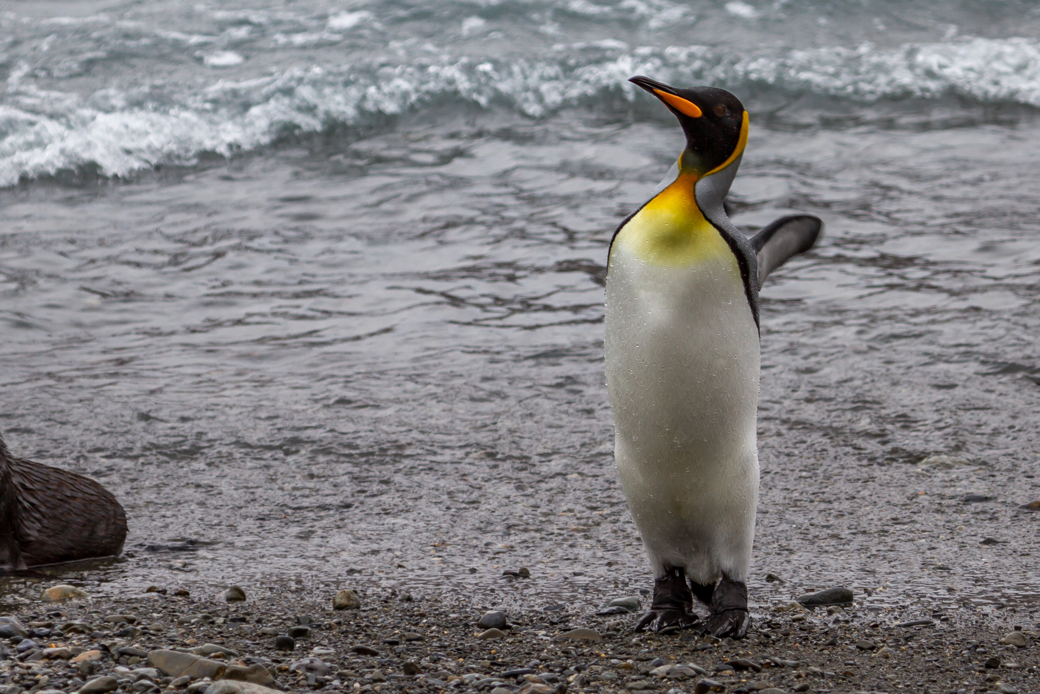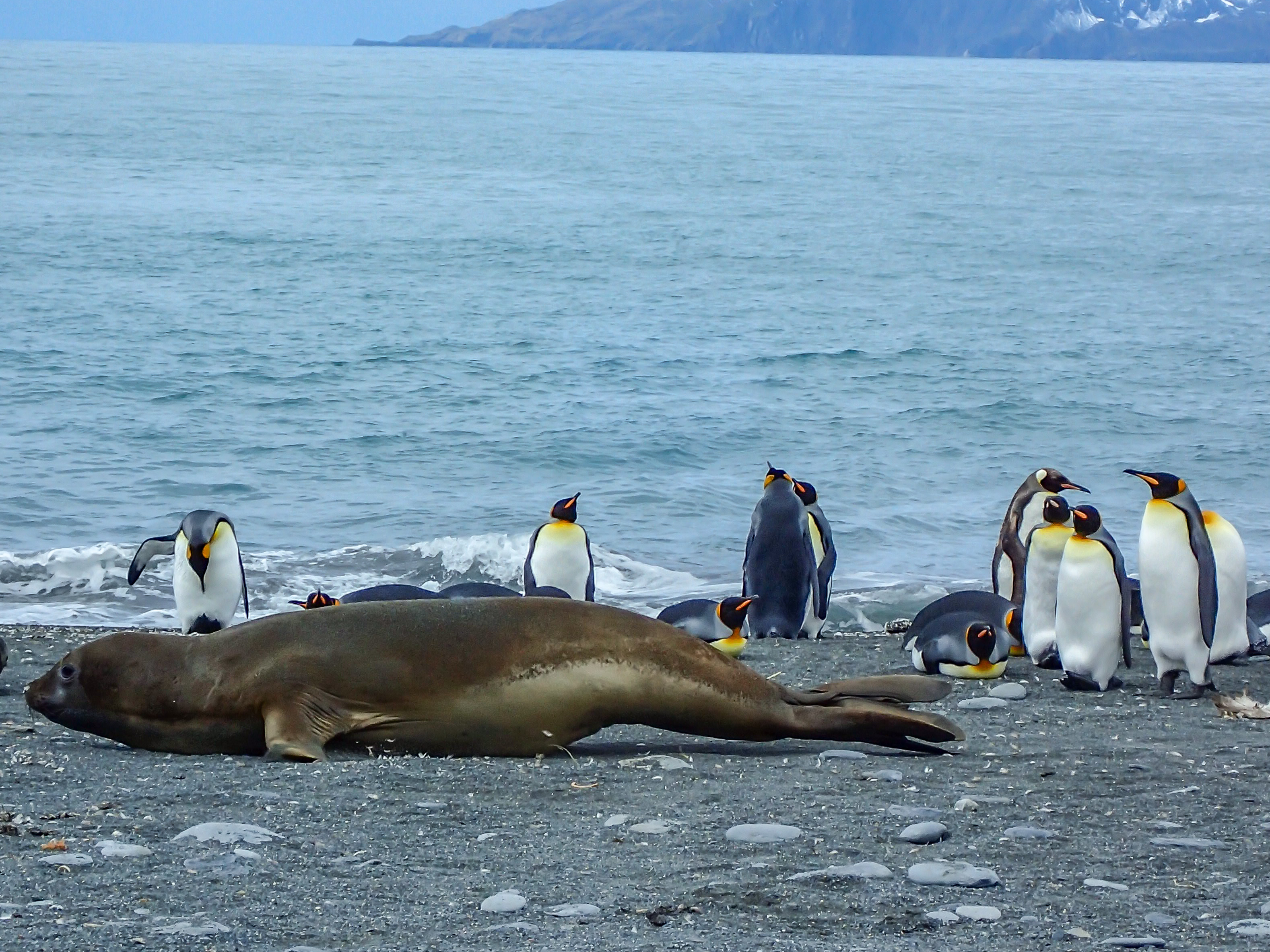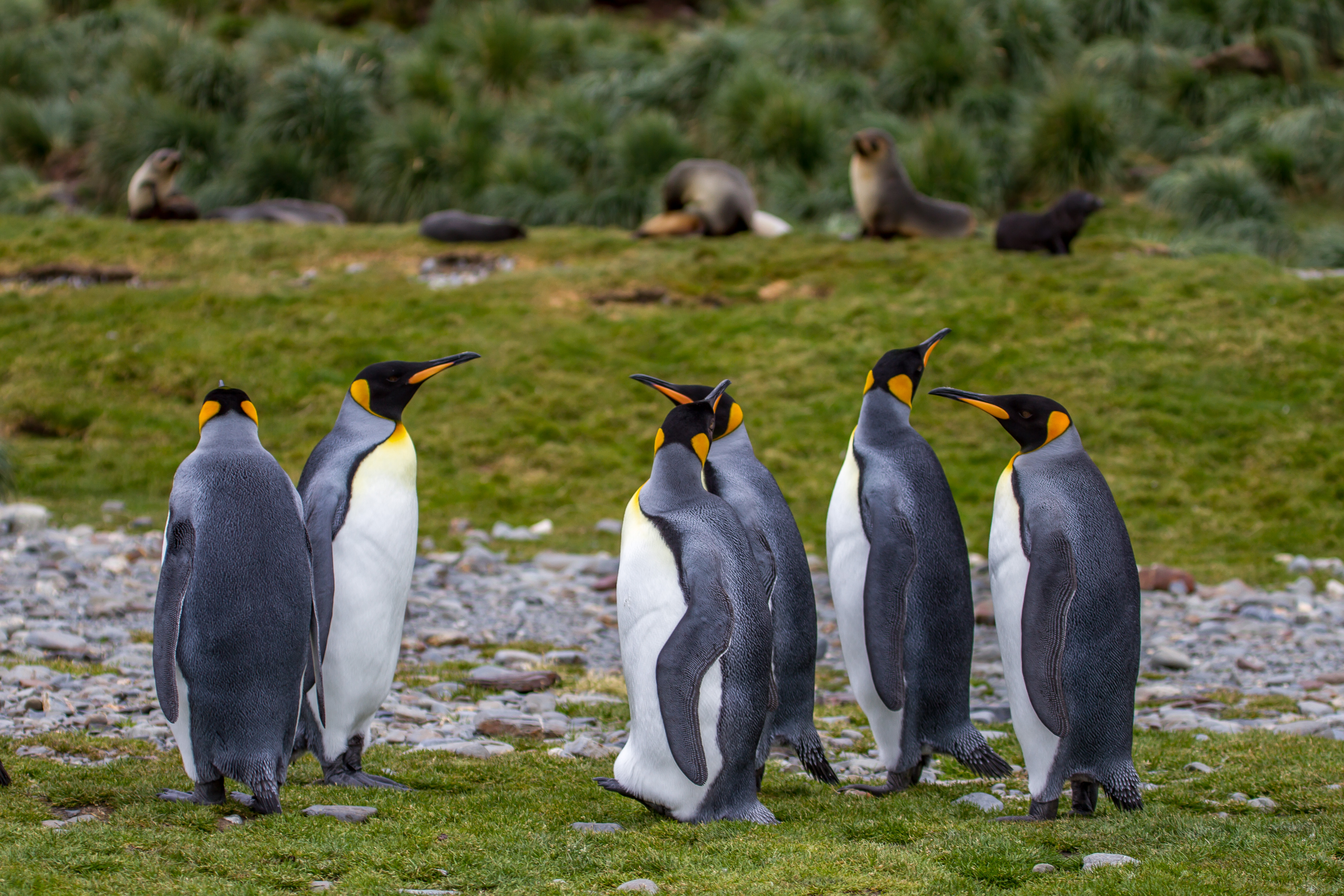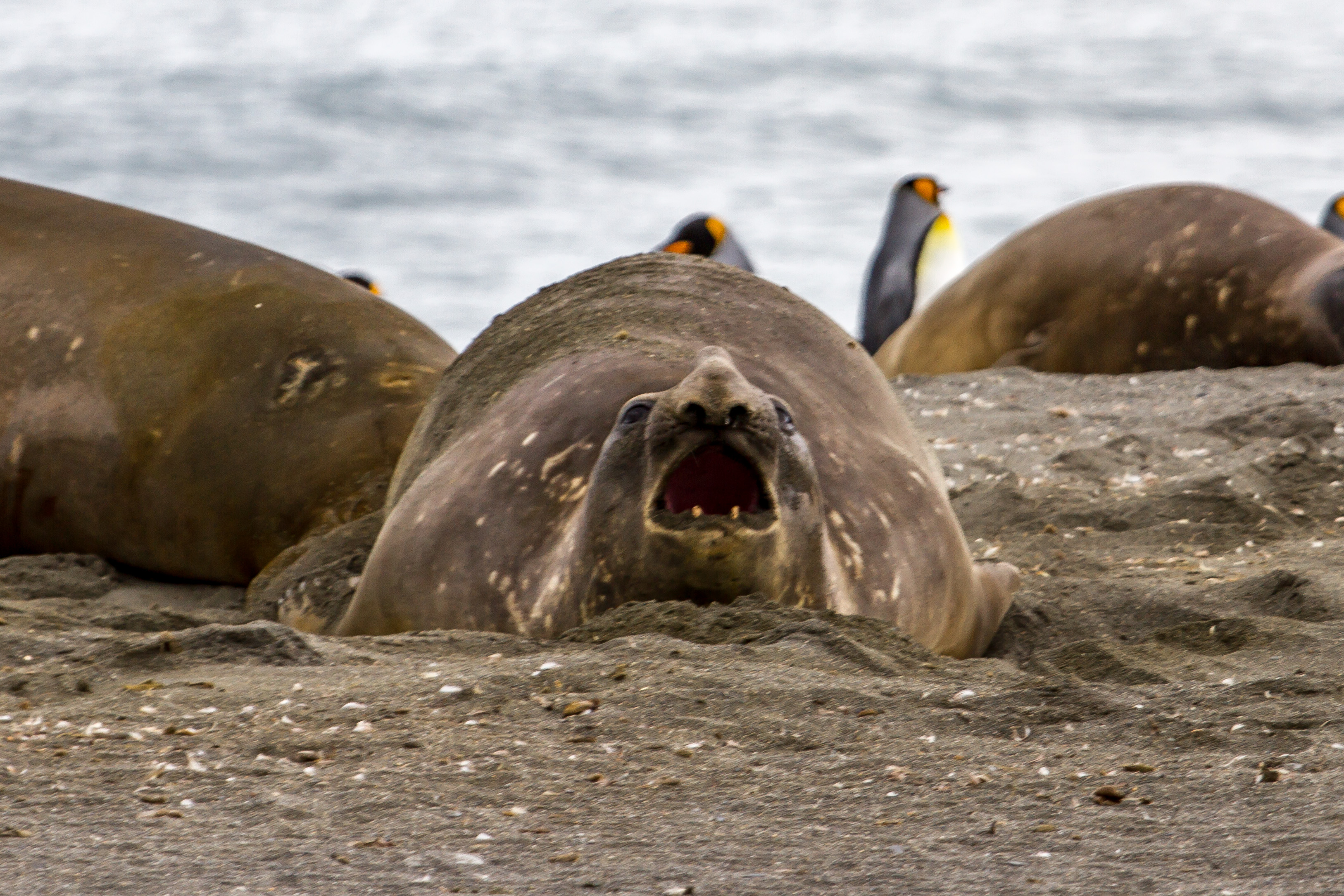 We walked 5 paces up the beach and had our briefing. “Stay it the flags, 2 meters from Penguins unless they come to you, 5 from the seals, 15 metres from Elephants” – “yeah, like I’m going closer then that!”. Then walked another 5 steps and stopped. We had seen it from the zodiac but it was not the same as standing on the beach with ……… King penguins. Their gold patches glowing in the sun. And they were everywhere. I mean everywhere. The beach was at least a 2km long and covered. Everyone took about 100 photos before moving 10 steps. Delegations of Kings came down to check us out. Very business like.
