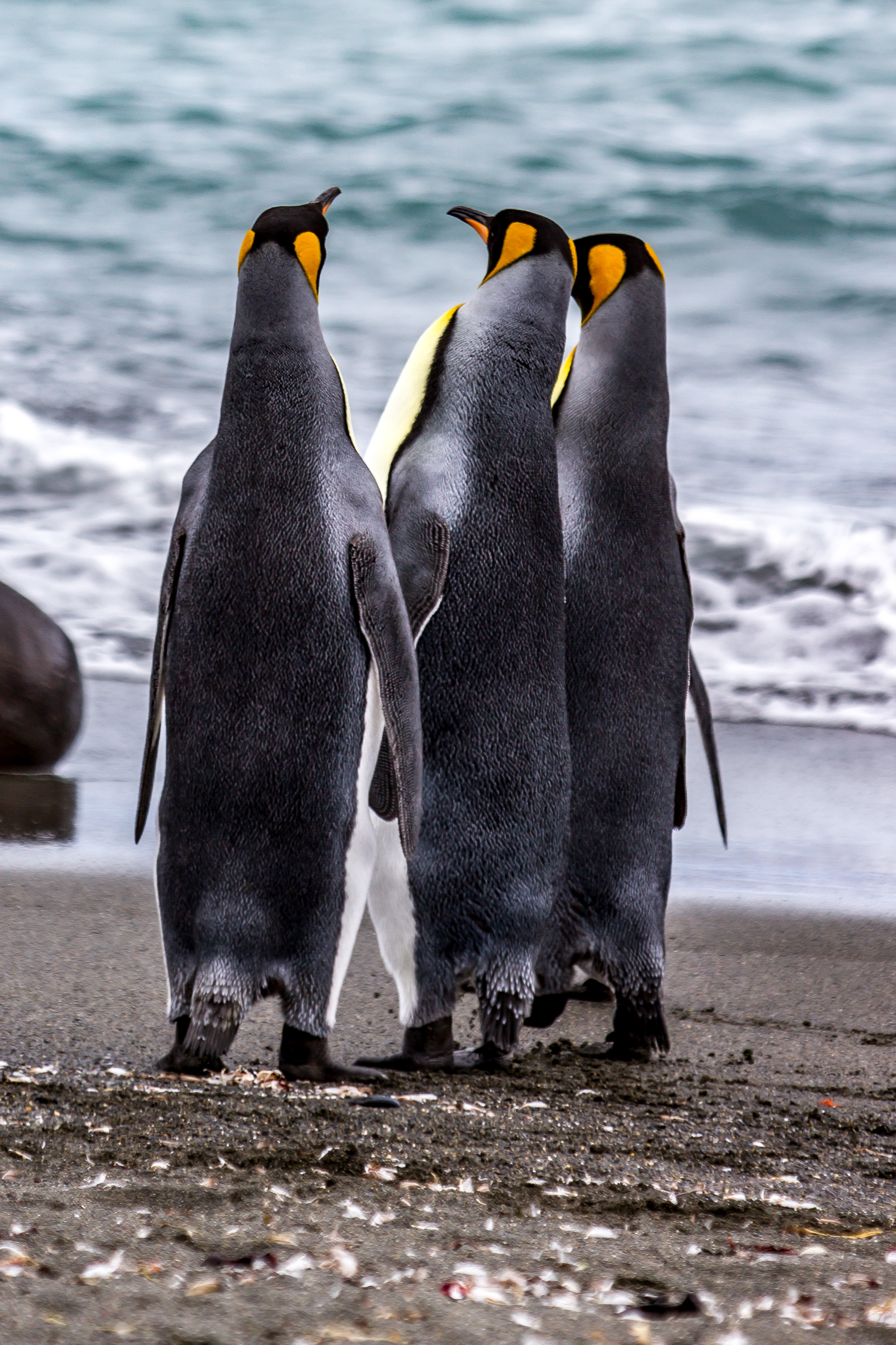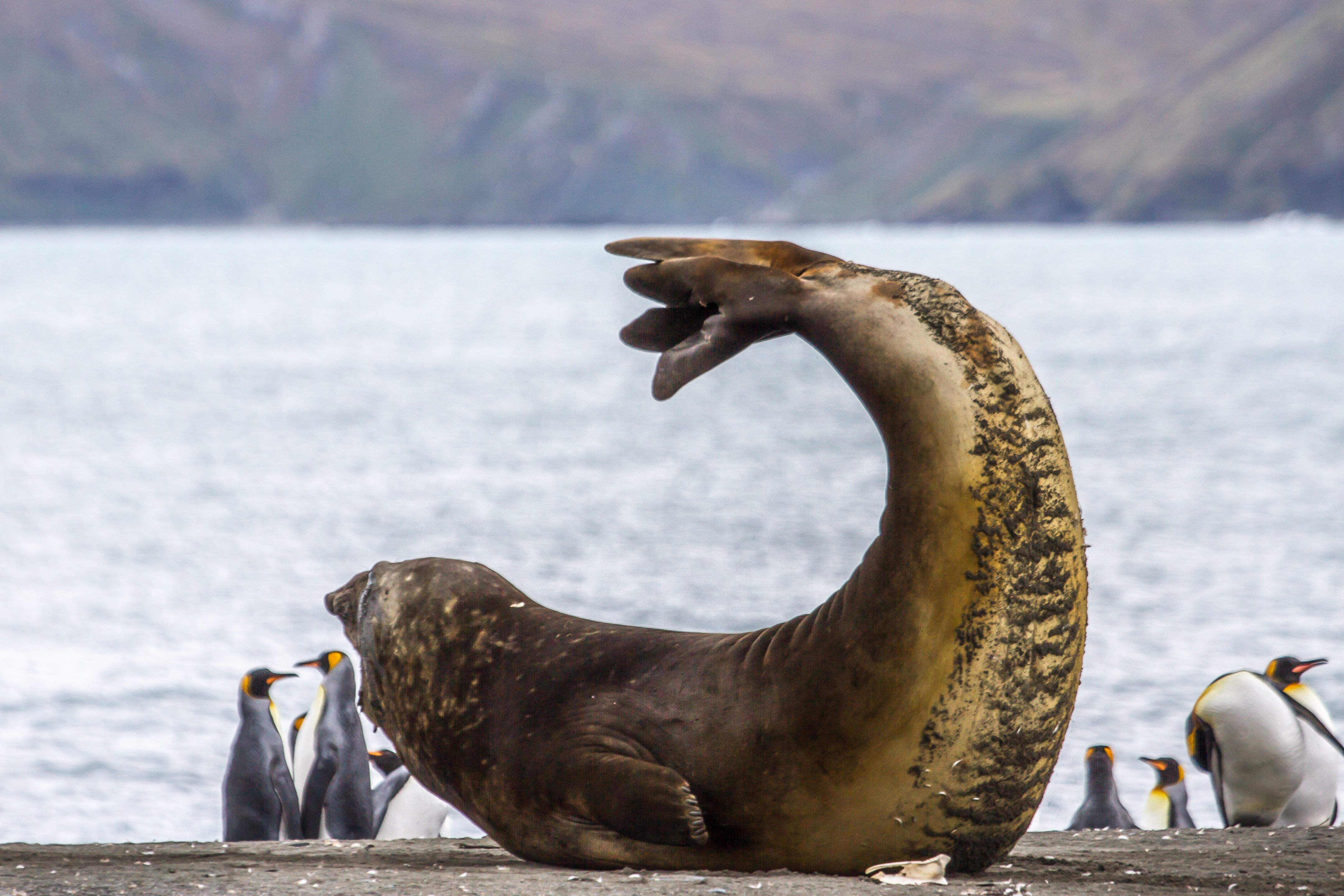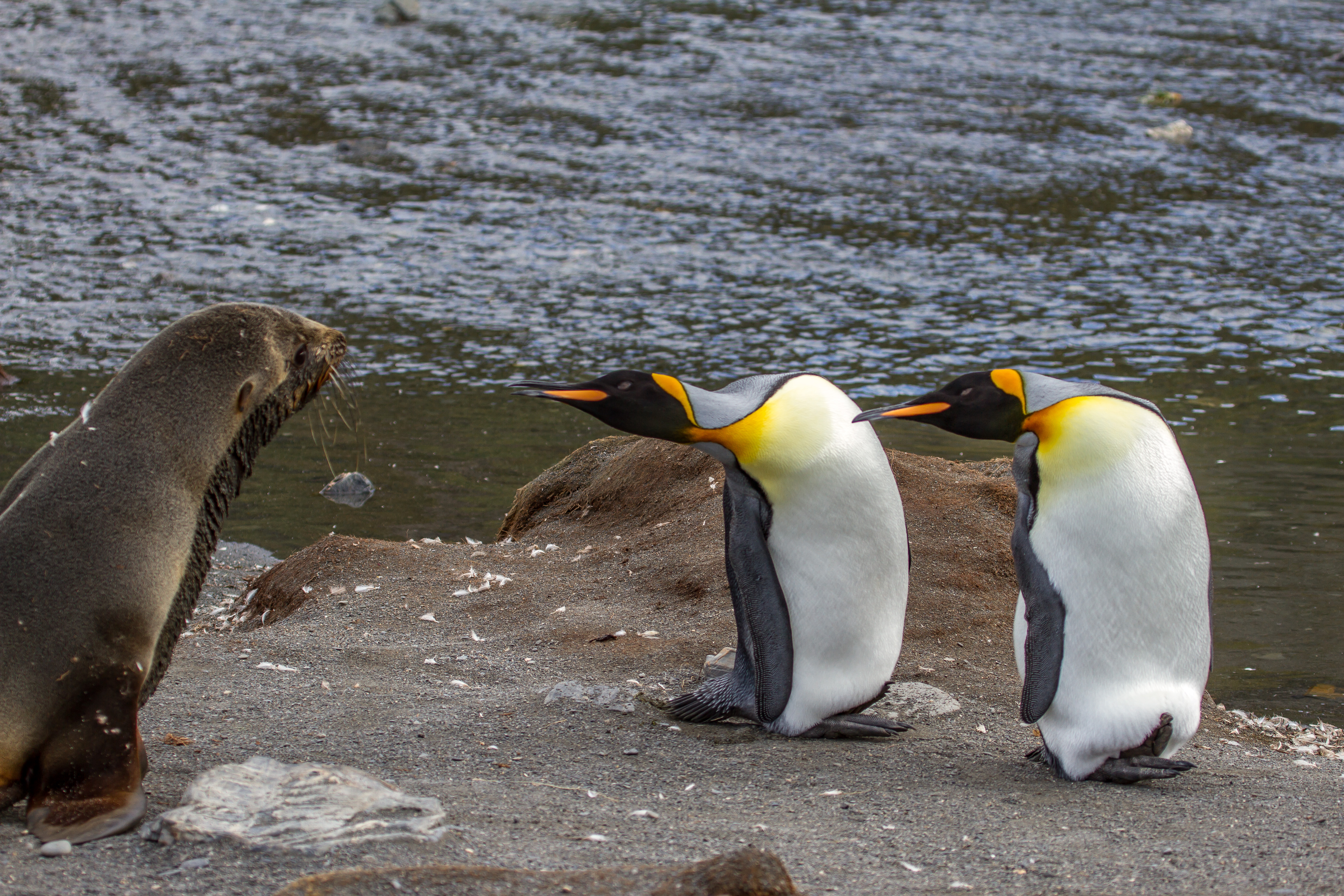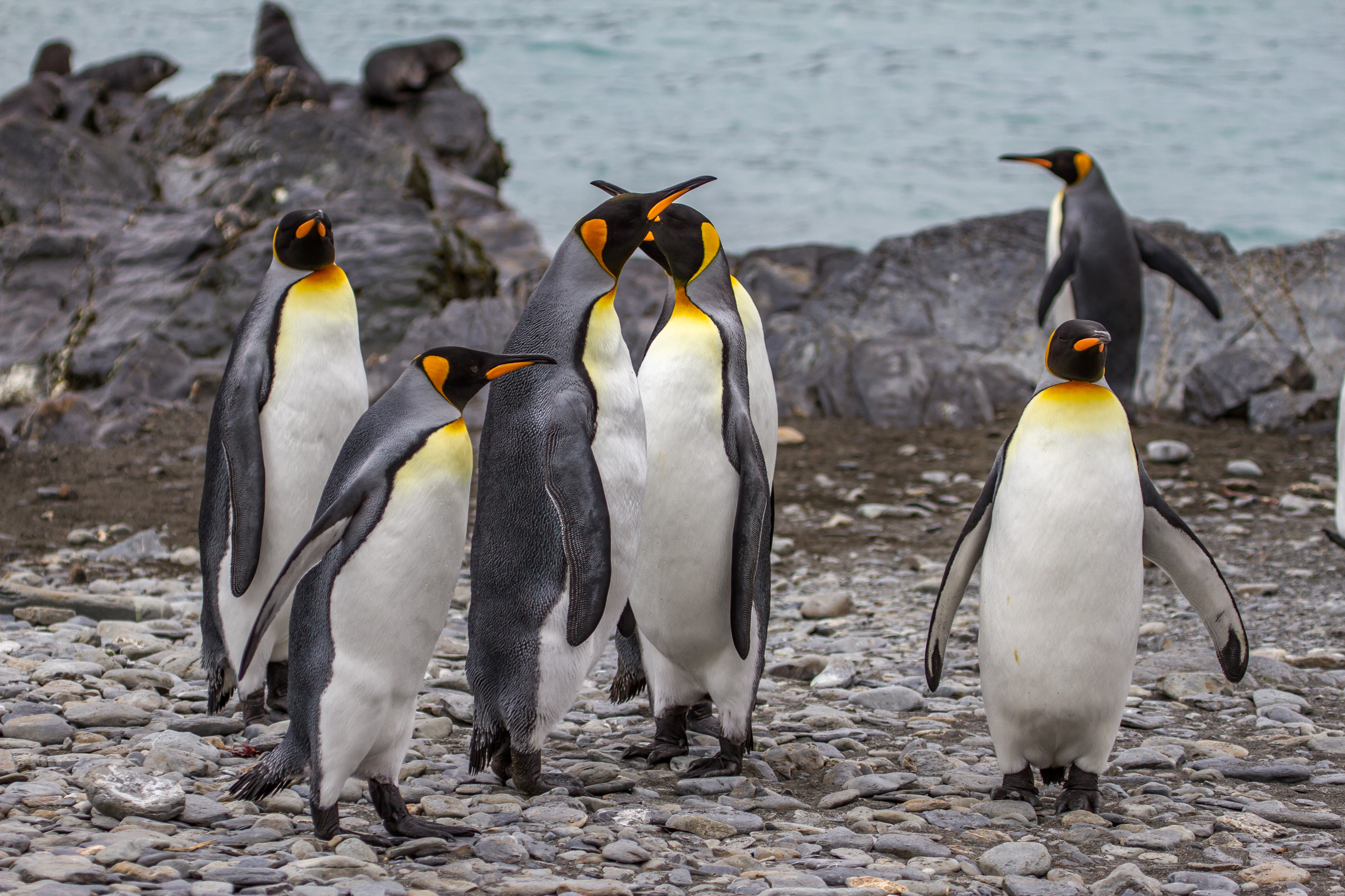 We walked 5 paces up the beach and had our briefing. “Stay it the flags, 2 meters from Penguins unless they come to you, 5 from the seals, 15 metres from Elephants” – “yeah, like I’m going closer then that!”. Then walked another 5 steps and stopped. We had seen it from the zodiac but it was not the same as standing on the beach with ……… King penguins. Their gold patches glowing in the sun. And they were everywhere. I mean everywhere. The beach was at least a 2km long and covered. Everyone took about 100 photos before moving 10 steps. Delegations of Kings came down to check us out. Very business like.