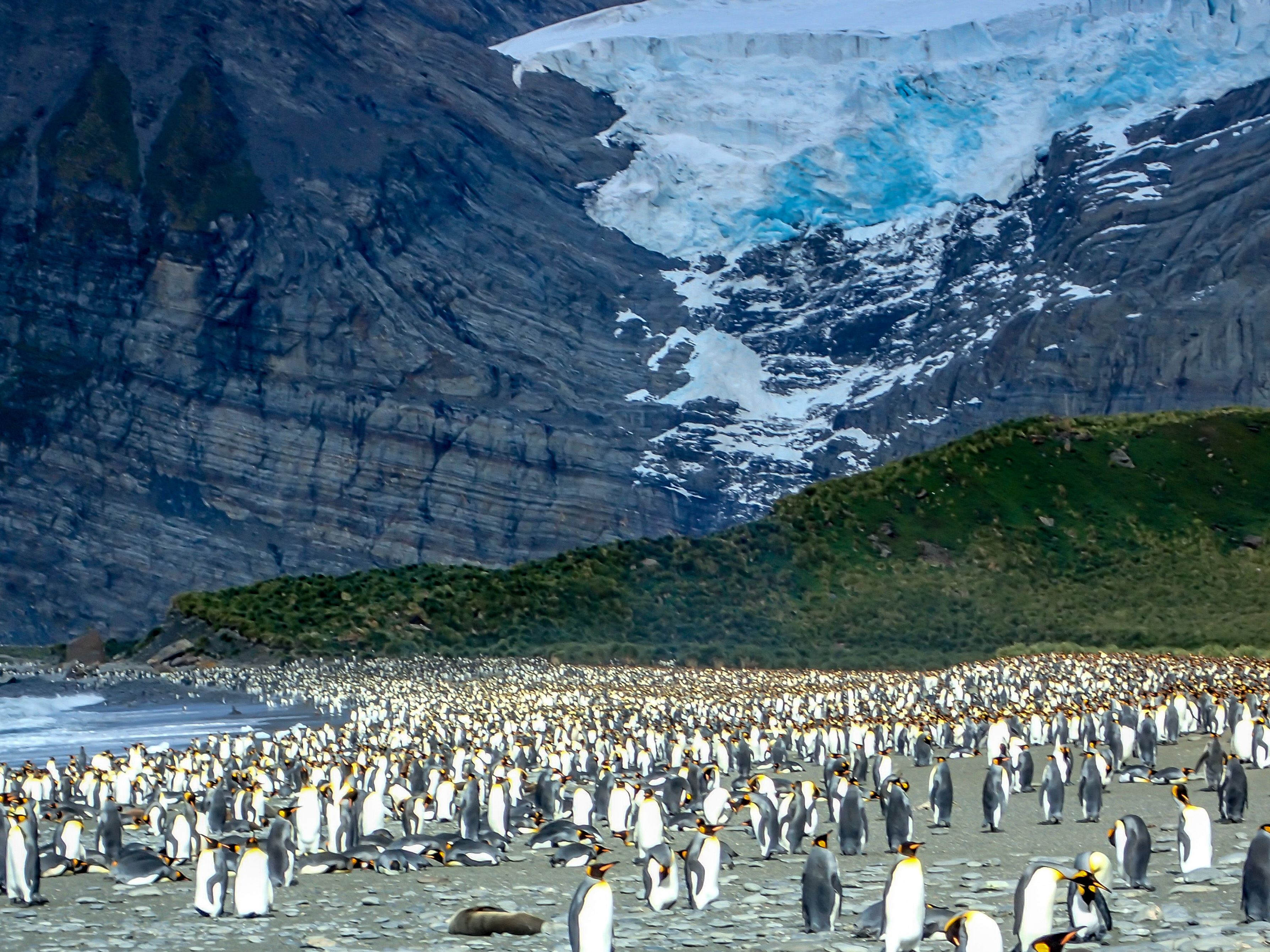 About 2 ks down the beach we ‘rock clambered’ up to the hill where we were going for the view. There were tens of thousands of Kings in front of a glacier. Dammed impressive. It was amazing.