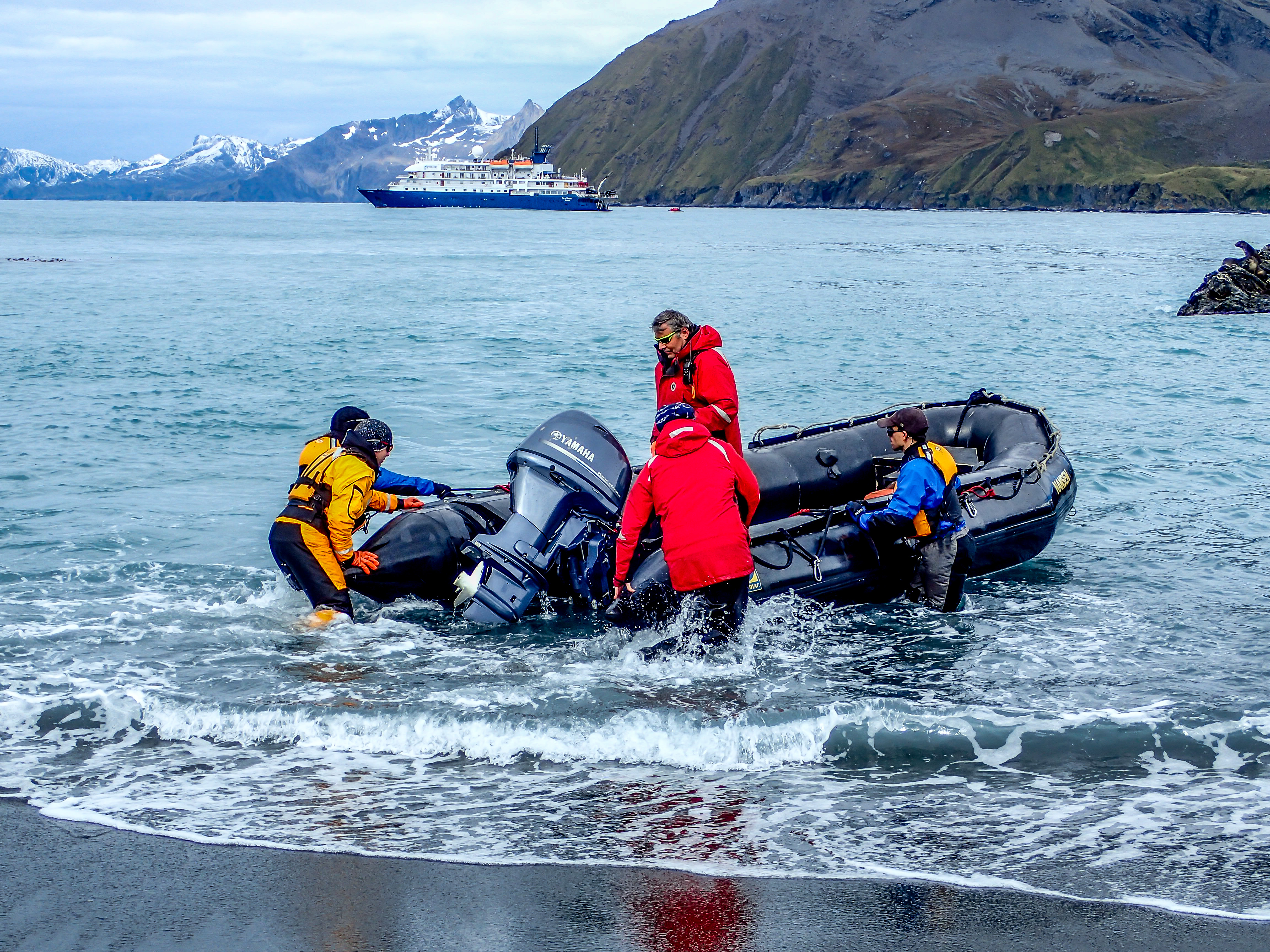 We landed on a steep black beach. Well, kind of landed. The zodiac went up to about 10 metres off the shore, spun around and shot in backwards. Four staff were the ‘landing crew’, wearing rescue suits and walked into the water to grab the boat. They dragged it up a bit then man handled us out one at a time.