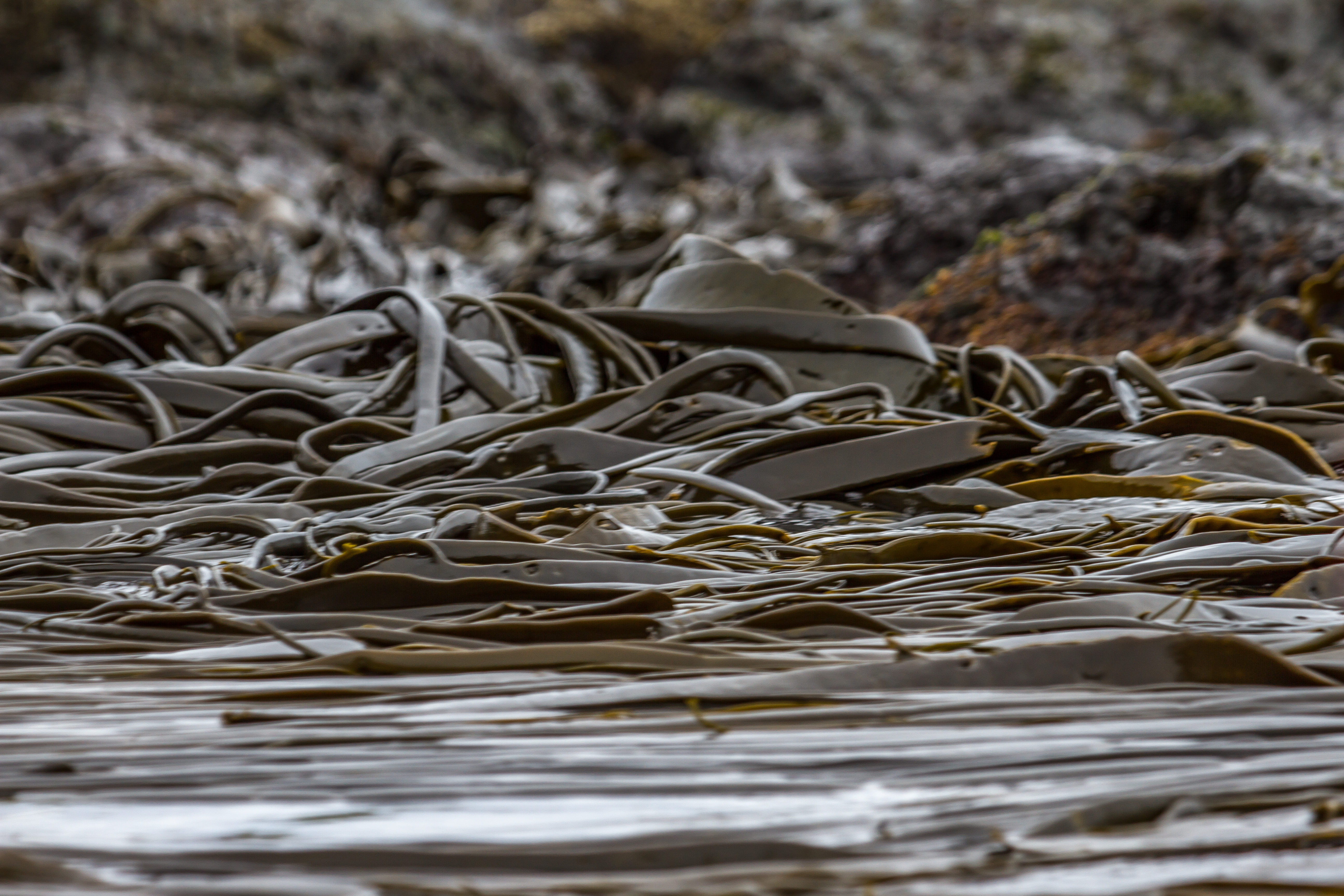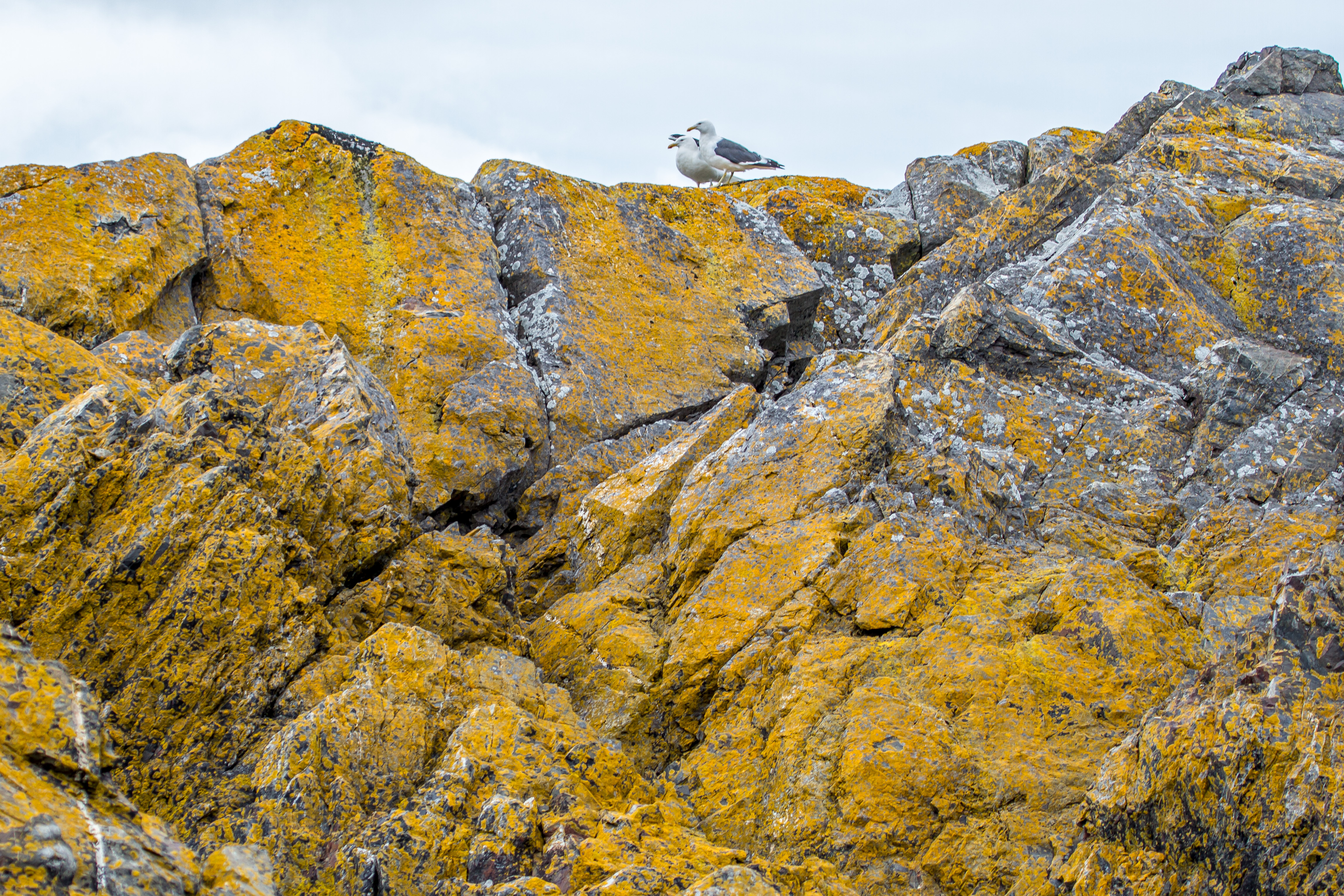 We went around an island and into a channel with huge kelp beds. This kelp makes our big stuff look tiny. In the area around the shore it was about 20 m long and so thick. It was also in a really dense growth pattern and looked sensational in surging water. In some places it was wound into a huge ball. Others were like intricate art works as the waves went back. For about 20 minutes we had to lift the motor and paddle. So lovely. Now I had the added excitement of the lichen all over the rocks. Again I was nearly busting with excitement at the beauty of this place.