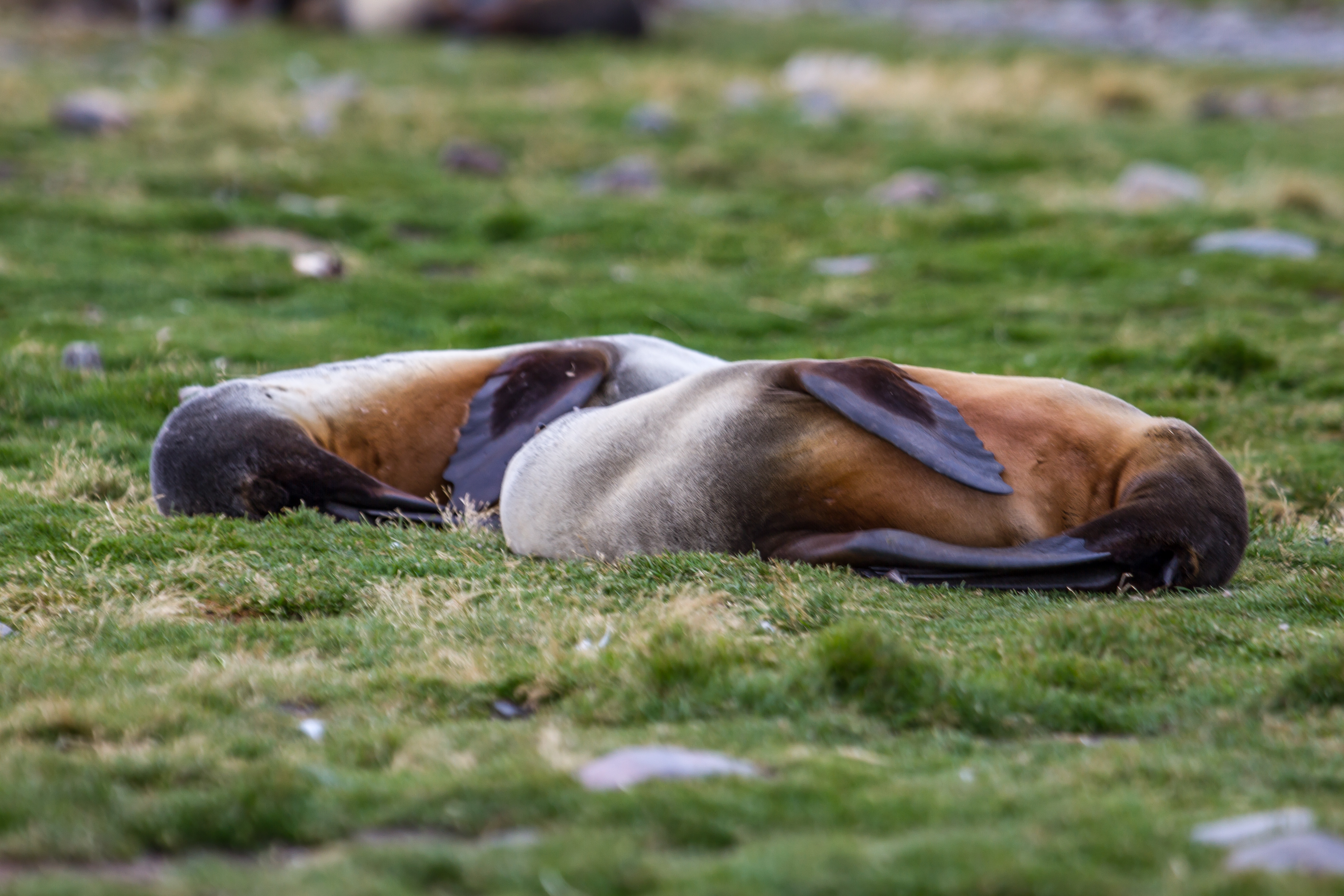 I managed to drag myself away and spent ages watching the young Fur Seals (who remember are really Sea Lions as they have ears and pelvises) frolic. They bound along and have play fights. Occasionally they would rush through a group of Kings and cop a rousing. Very funny. Up and down the beach, through the stream of glacial melt. Up and down into tussocks. Yodelling, growling and racing around. Then like all toddlers they would suddenly collapse with exhaustion. Flop, right where they were and bang, asleep. Cute yawns, scratching and cuddling up of the flippers.