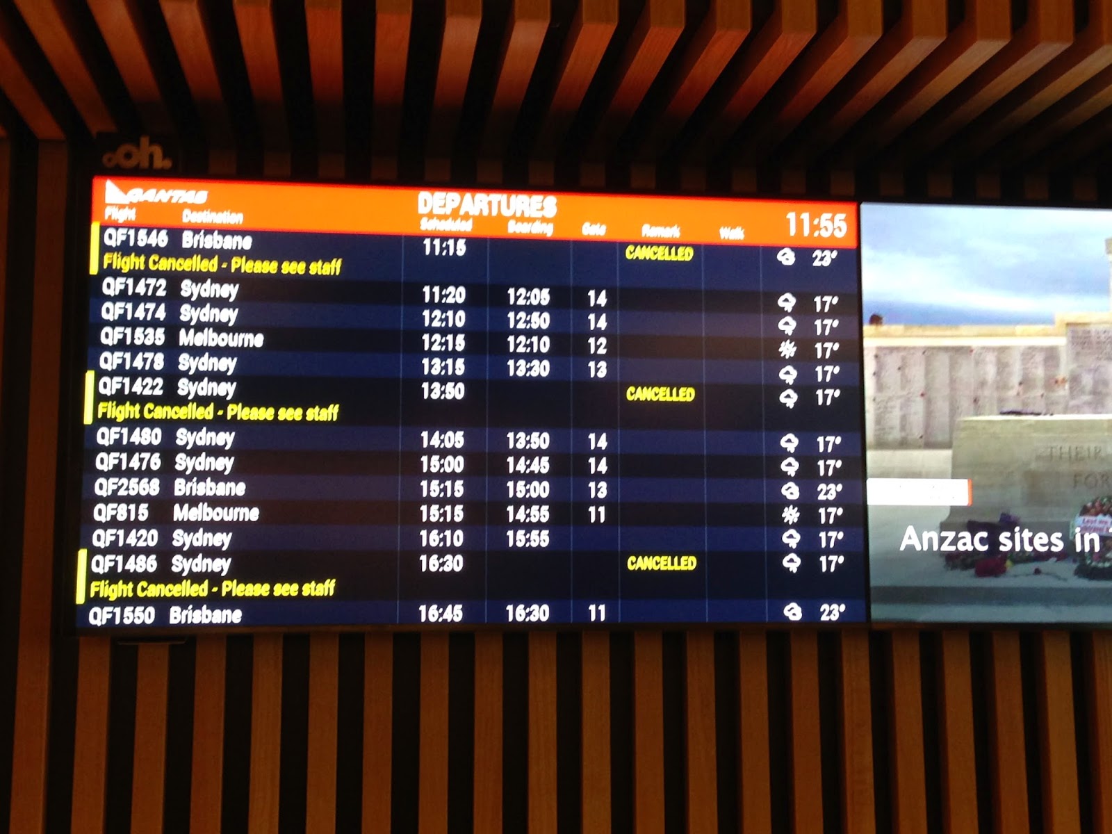 I got to the Canberra airport nice and early. On the way I got the first message re a 60 minute flight delay. They moved me to an earlier flight (that left only 45 minutes after the original flight) and I made it to Sydney.