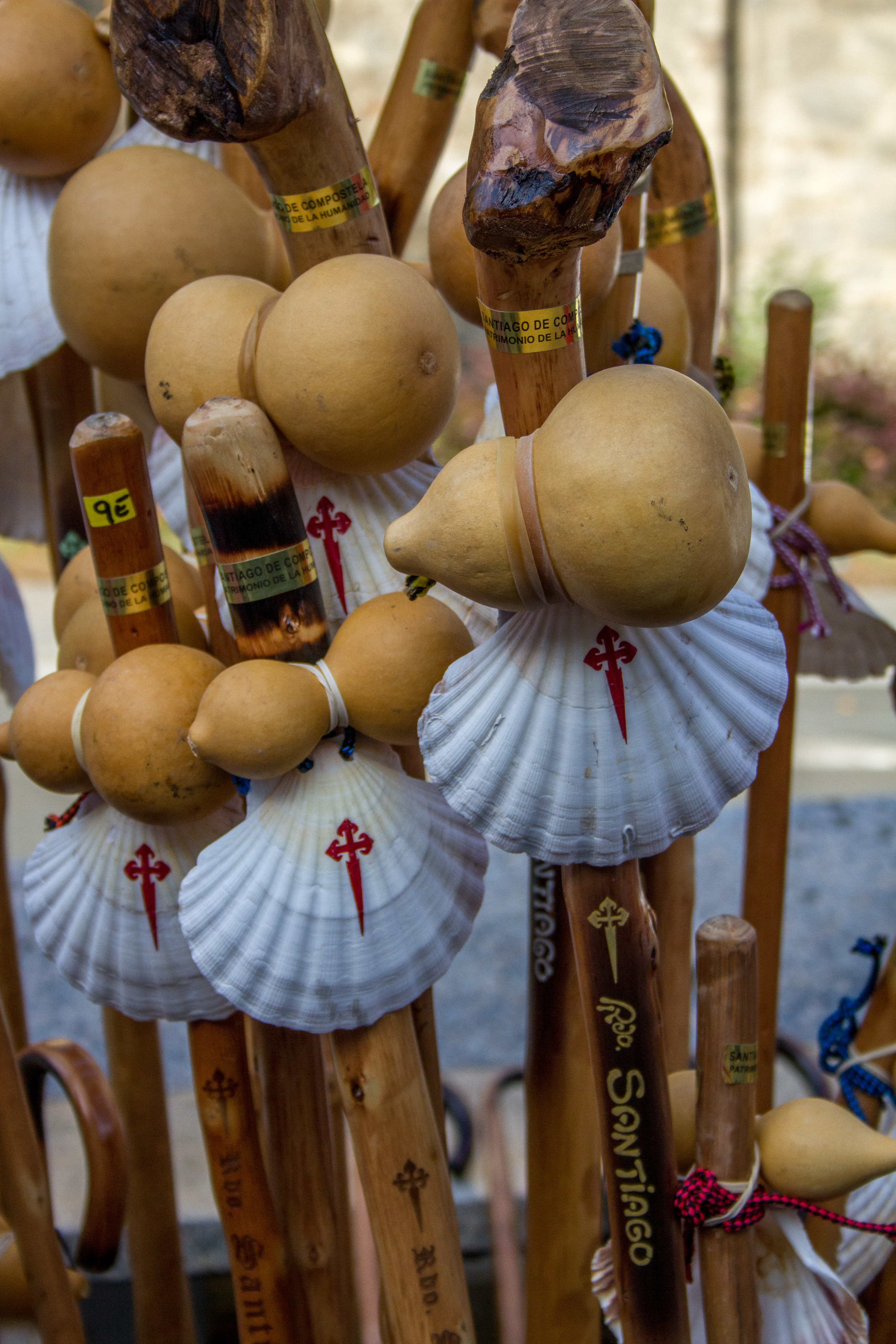 The symbol of Camino de Santiago . The walking pole, the gourd for water, the scallop shell with its nine ways leading pilgrims to Cathedral of Santiago de Compsstela.